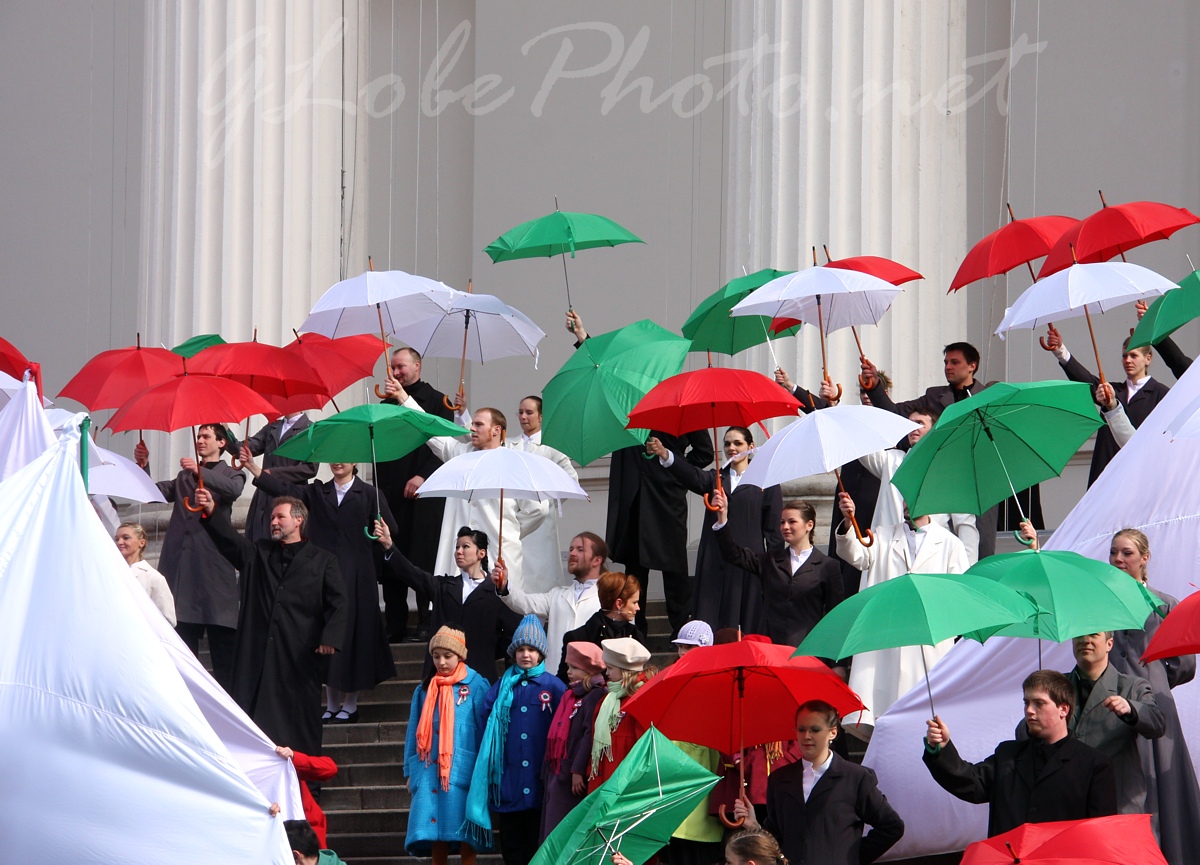 ifjakkal, trikolor esernyőkkel 2010. március 15-én a Nemzeti Múzeum kertjében National Holiday ceremony in the garden of National Museum; memorial day of the Hungarian Revolution of 1848 |